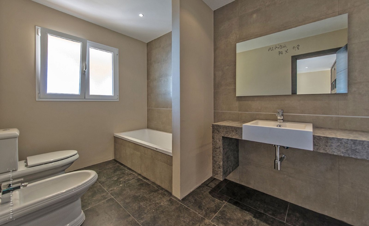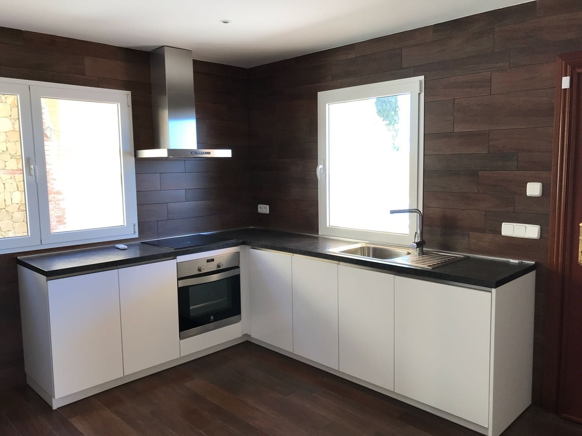 It has 4 big bedrooms, all of them with en suite bathrooms, the master one with walking dressing room, a well equipped kitchen, a dining room, a large living room with a fire place, a covered terrace, a guess toilette, a closed garage for 1 car, a big parking space for 4 cars, and a large patio with a swimming pool.