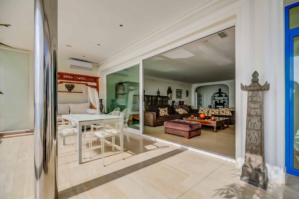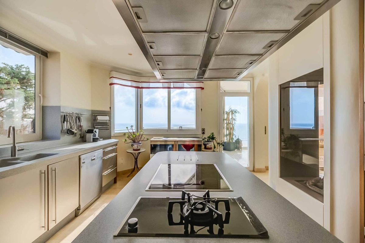 The expansive terrace is enclosed with elegant glass curtains, allowing year-round enjoyment of panoramic sea and coastal views.