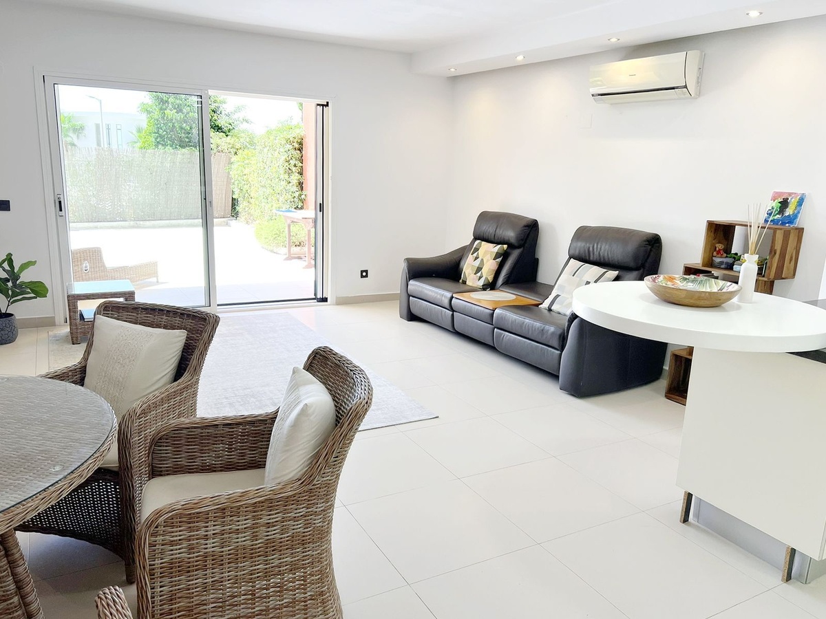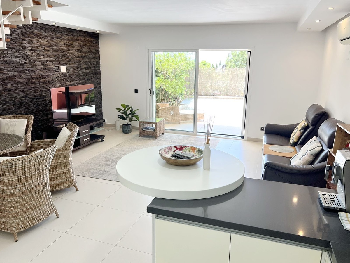 WONDERFUL TOWNHOUSE FOR SALE located in the prestigious and sought-after location, La Reserva del Higuerón. Situated between Benalmadena and Mijas Pueblo with easy access to highway, beaches and a variety of shops & restaurants. Only a few meters away you find the Hilton Hotel which has a popular sports center with paddle and tennis courts, gym, wellness spa, roof-top infinity pool and the famous Sollo restaurant. This two-storey townhouse is very light & airy. Tastefully decorated and very well presented. There is an entrance porch. The property has a spacious living/dining room. There are sliding doors that lead onto a wonderful covered terrace and open patio -- a private space for sun-bathing, to chill-out or dine "al fresco". Marquee. Open-plan fully fitted kitchen. Guest Wc. Halogen lights. Windows are all double-glazed, with mosquito nets and window shutters. A/C h+c. Wifi/ADSL. Fiber optics. Alarm. TOP FLOOR: Master bedroom with built-in wardrobes and en suite bathroom/shower. 2 Further guest bedrooms with wardrobes. Guest shower room in hall. The complex is well-maintained with lush landscaped gardens and 2 communal swimming pools. There is a security barrier at the entrance of the community; each property has it's own designated parking space within the complex. Boasts wonderful sea views and all within walking distance of public transport, a variety of shops and several restaurants! The property offers commodity in an idyllic environment with peaceful surroundings. Ideal as a holiday/retirement or permanent home. Many more extras! VIEWINGS HIGHLY RECOMMENDED.