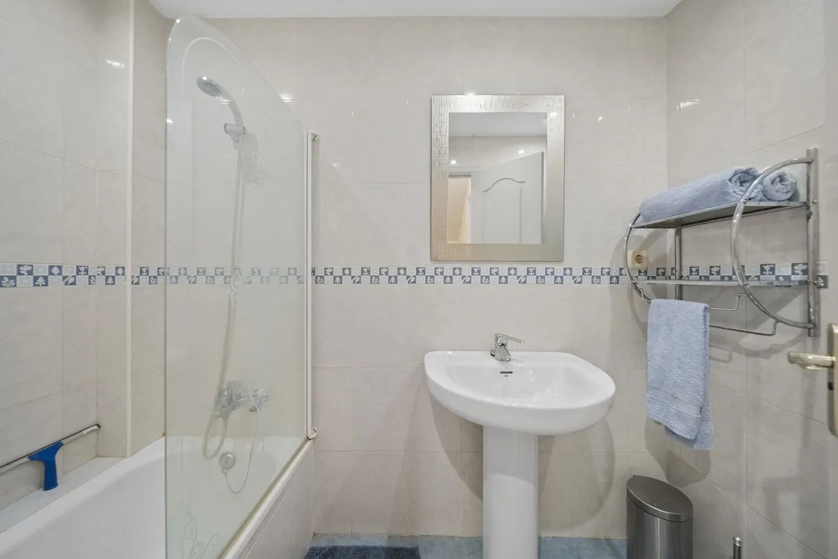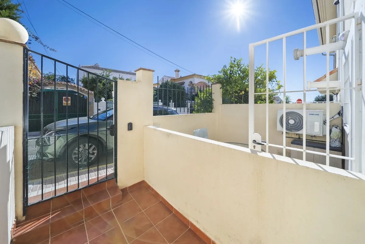 Enter via a gated entrance into a bright hallway leading to a spacious living-dining area that opens onto a large terrace with toldos (awnings) — perfect for alfresco dining or sunbathing. The terrace allows direct access to the communal gardens and pool.