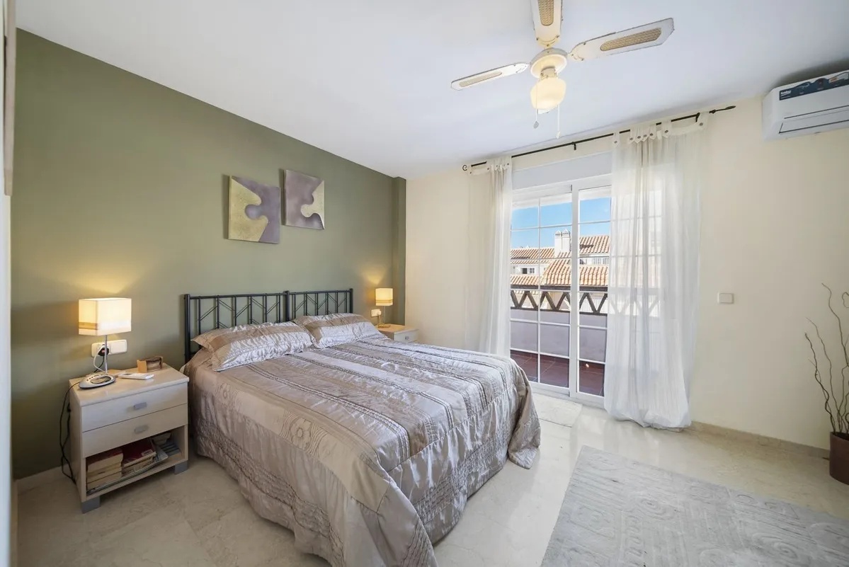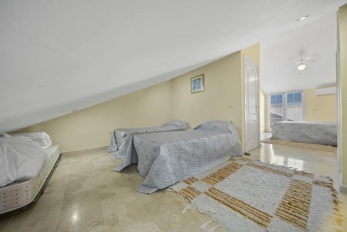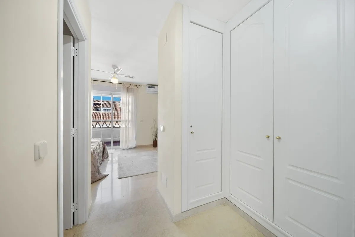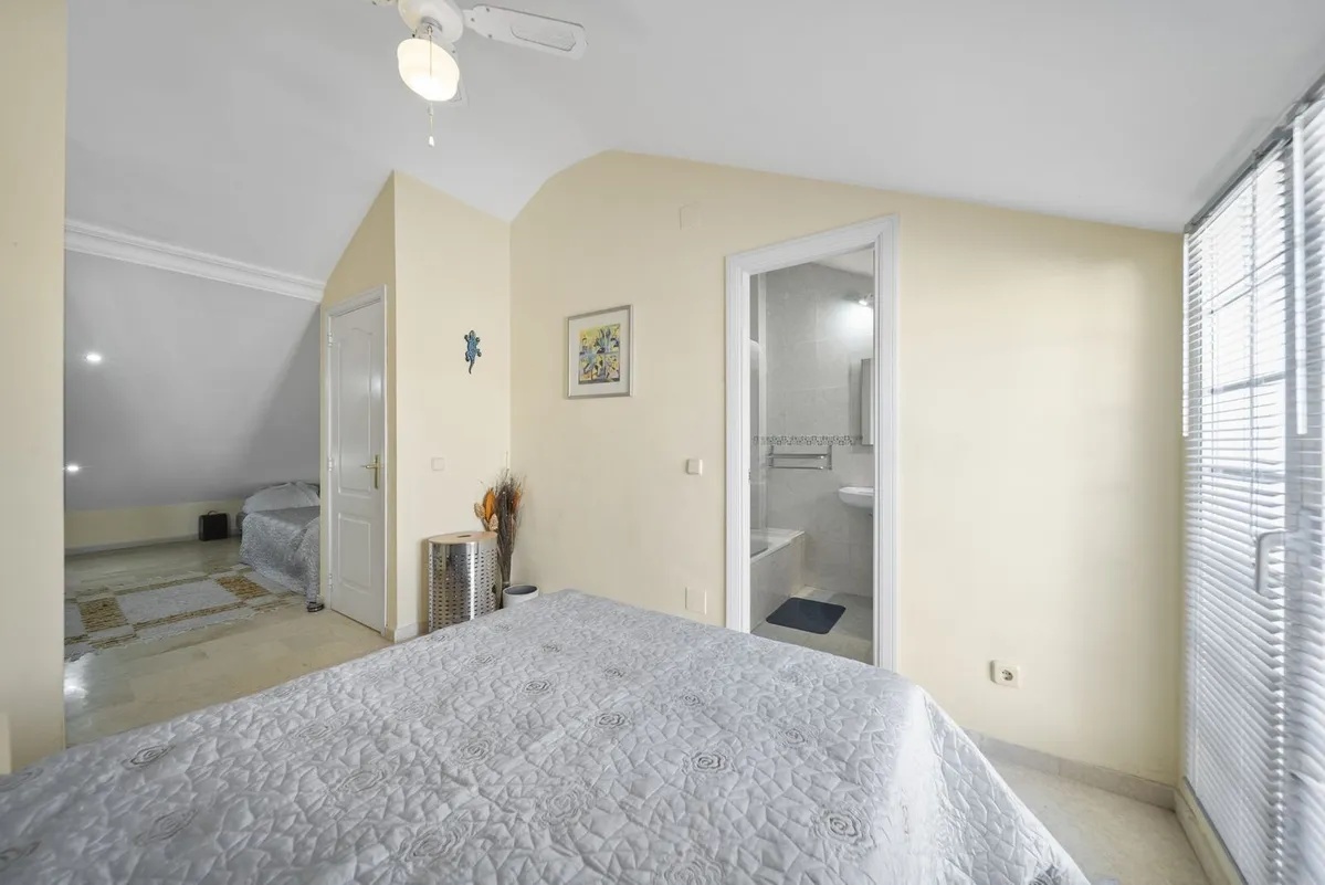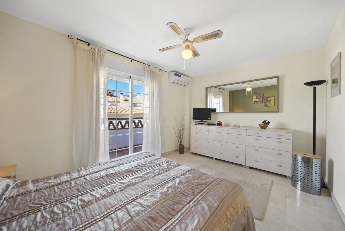A private top-floor retreat featuring fitted wardrobes, an en-suite bathroom, and double doors opening onto a spacious terrace — ideal for enjoying the evening sun and panoramic sea and mountain views.
