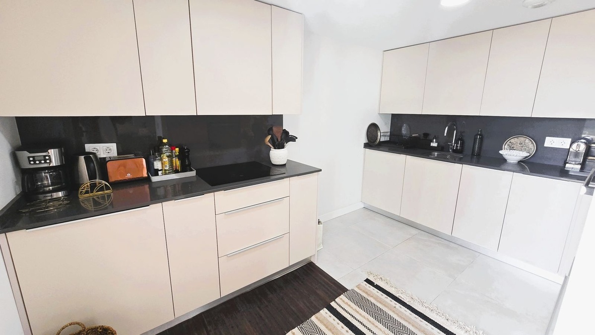 The open-plan living and dining area is the heart of the home, designed to provide both style and functionality. Clean architectural lines, a refined contemporary finish, and a seamless connection to the outdoor areas give the property an airy and elegant feel. The modern kitchen is fully equipped and finished with quality materials that complement the home’s sleek aesthetic.
