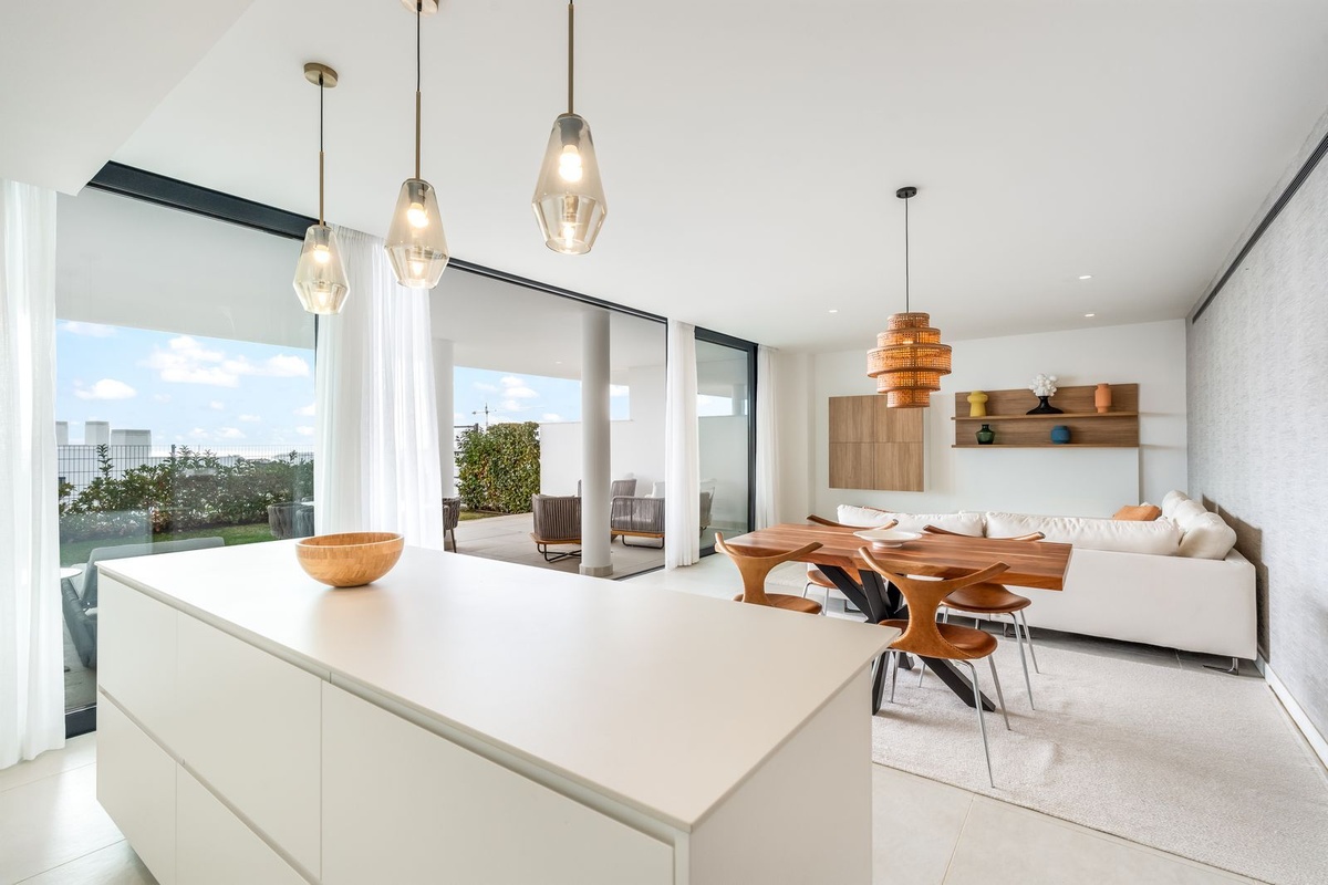 The home is filled with natural light and features a spacious lounge-dining area with an open-plan kitchen that seamlessly connects to a sunny terrace and private garden, ideal for relaxing, entertaining, or enjoying the partial sea views. Both bedrooms enjoy access to a second private terrace, creating additional outdoor space and a serene retreat. Two modern bathrooms complete the apartment, providing ample comfort for family or guests.