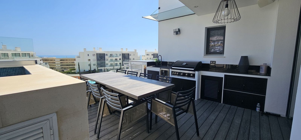 Penthouse for sale in Higueron West Phase III. With private pool. We present this spectacular penthouse, located in the exclusive Higuerón West complex, within the prestigious Higuerón Resort, with breathtaking panoramic views of the entire Fuengirola coastline. Its prime location, just minutes from Benalmádena, Marbella, Puerto Banús, and Málaga, allows you to enjoy much more than sun and sand: an exceptional array of gastronomy, culture, sports, nature, and leisure activities in a unique setting. You will also have preferential access to the resort's facilities, including a spa, sports areas, and a beach club, ideal for a healthy and relaxed lifestyle. The property offers convenient access via both stairs and a direct elevator from the garage, which connects exclusively to the interior. Upon entering, you are greeted by a spacious and bright living-dining room with an open-plan kitchen fully equipped with high-end appliances. Adjacent to the kitchen is a practical laundry room with a washing machine, dryer, and an aerothermal heating system. The living room boasts spectacular 180º views of the sea, coastline, and mountains, thanks to its large windows with security glass, which also provide access to an impressive terrace. This outdoor space features a private swimming pool, a dining area for eight, sun loungers, and pre-installation for an outdoor kitchen or barbecue, perfect for enjoying the Mediterranean climate year-round. In the sleeping area, the property includes a guest toilet, a full bathroom, two guest bedrooms with built-in wardrobes, and an elegant master bedroom with a dressing room and en-suite bathroom equipped with a bathtub and shower. The property is delivered fully furnished with carefully selected, high-quality pieces, making it a move-in ready option or an ideal investment. A unique property that combines design, exclusivity, and quality of life in an unparalleled setting.