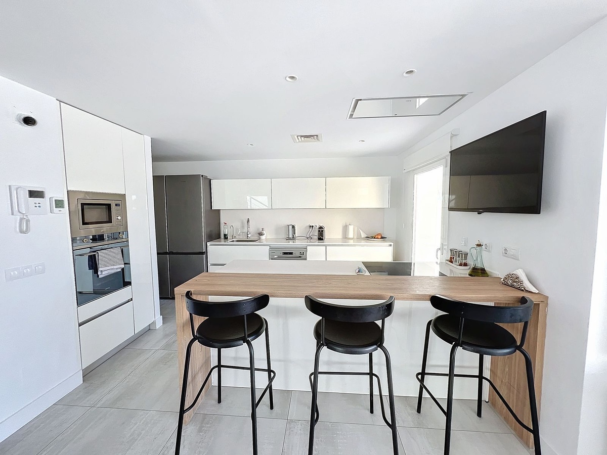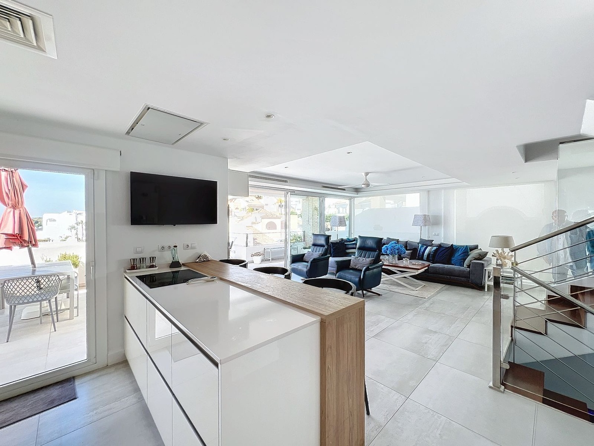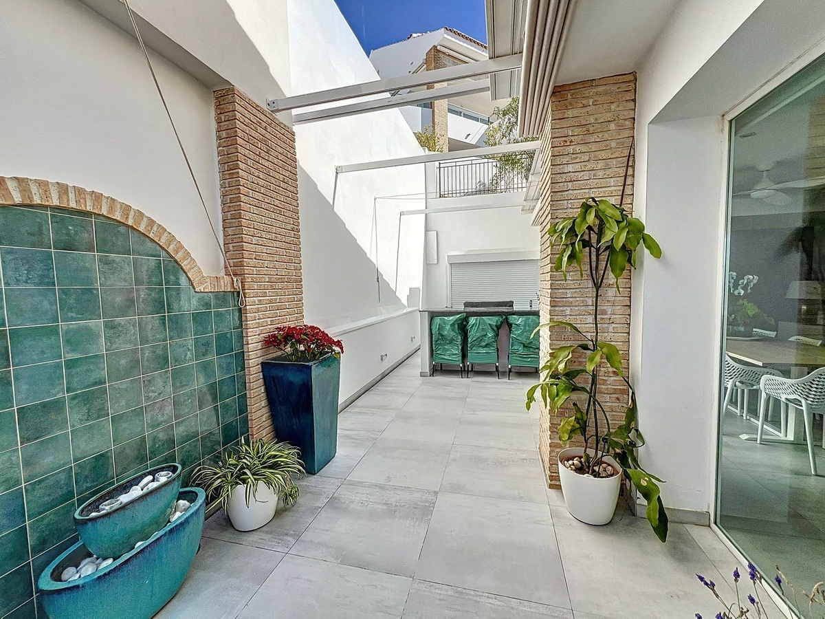 Ubicado en la distinguida comunidad de Big Blue Villas en Benalmádena, este excepcional chalet adosado encarna la esencia del lujo costero. Distribuido en tres niveles, esta residencia ofrece tres amplios dormitorios, tres baños y un aseo adicional para invitados, garantizando un espacio amplio para una vida cómoda. La planta baja te da la bienvenida con una cautivadora sala de estar, que cuenta con un elegante bar adornado con iluminación LED, perfecto para recibir reuniones, y equipado con un televisor proyector. El acceso a la terraza aumenta el atractivo, ampliando las posibilidades de entretenimiento al aire libre. El dormitorio principal, convenientemente ubicado en este nivel, cuenta con un amplio baño en suite y un impresionante vestidor. Además, un dormitorio de invitados con baño en suite complementa este nivel, asegurando privacidad y comodidad. Ascendiendo al primer piso se revela una impresionante sala de estar, conectada de manera fluida a una moderna cocina abierta completamente equipada, un comedor y un área de servicio. La amplia terraza en este nivel ofrece vistas panorámicas al mar, envolviendo la propiedad, y cuenta con un bar integrado, mejorando la experiencia de entretenimiento al aire libre. En la planta superior, otro dormitorio de invitados en suite espera, completo con acceso a su propia terraza privada, proporcionando un retiro sereno con vistas impresionantes. En el exterior, los residentes pueden disfrutar de jardines bellamente ajardinados, disfrutar de la piscina comunitaria o mantener un estilo de vida activo en el gimnasio bien equipado y las áreas sociales. El ático también cuenta con una zona de barbacoa para cenar al aire libre, múltiples terrazas y estacionamiento privado. Con su acceso envidiable a la playa y servicios cercanos, este ático combina perfectamente el lujo y la conveniencia, ofreciendo una experiencia de vida costera incomparable en Big Blue Villas.