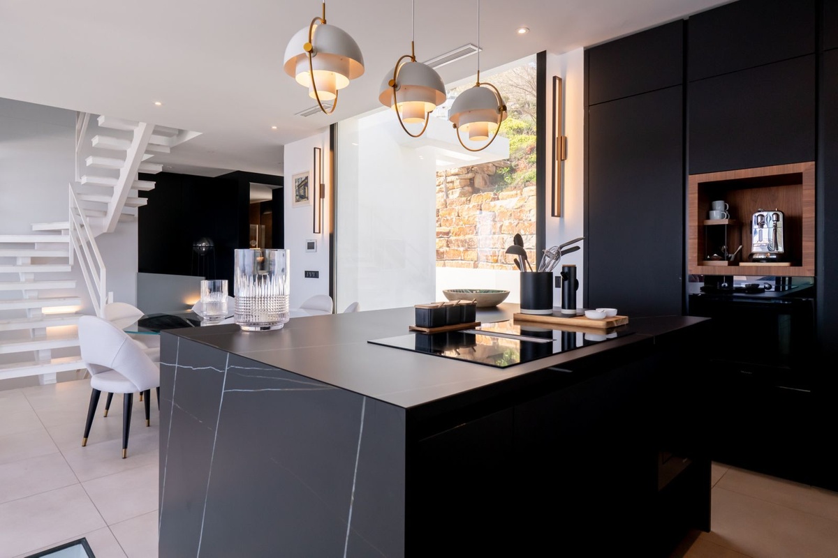 Una Stupa Villa hecha a medida cuidadosamente diseñada por un arquitecto local bien establecido en estrecha colaboración con los propietarios que juntos crearon esta obra maestra esculpida en, alrededor y encima de las rocas sólidas de Retamar, justo debajo del Templo de la Iluminación Stupa. Cinco niveles de arquitectura de vanguardia. Desde el garaje para dos coches con prevision de ascensor, hasta la planta de entretenimiento con estación de catering y dos dormitorios de invitados con baño, hasta la planta baja con cocina abierta, comedor y sala de estar, incluido un tercer dormitorio de invitados con baño de invitados, hasta el primer piso. alberga la suite principal con vestidor, tocador doble, ducha e inodoro, incluida la oficina privada que posiblemente ofrece una de las mejores vistas de la ciudad y el gran solárium en la parte superior. Todos los pisos se sienten muy luminosos y todas las habitaciones son muy luminosas y están abiertas a sus balcones o terrazas exclusivos. Calefacción por suelo radiante en toda la casa. El salón cuenta con cortinas eléctricas. La cocina totalmente equipada con electrodomésticos Miele y una isla de piedra negra se abre al comedor cubierto al aire libre. La terraza trasera alberga una cocina al aire libre Sunstone totalmente equipada y una fuente de agua en la pared de roca. Al salir a través de las puertas corredizas de vidrio de la cocina y el salón, encontrará la hermosa terraza con piscina infinita con ducha al aire libre y chimenea de leña transparente. Cubierta eléctrica para piscina y calefacción de piscina instalada. Varias terrazas y balcones cubiertos y descubiertos rodean la casa, todas ofreciendo esas inmejorables vistas al mar Mediterráneo. Nos se enorgullece de ofrecer el epítome de la vida moderna y lujosa ahora a la venta en Benalmádena. Por favor contáctenos para más información o una visita.