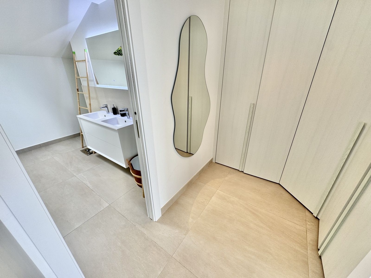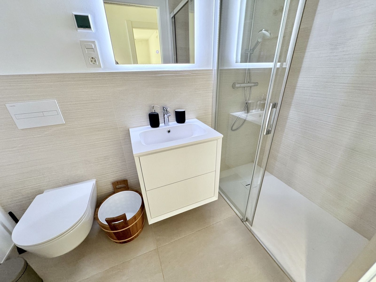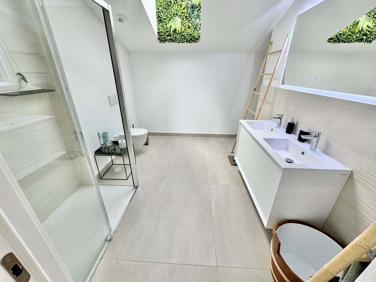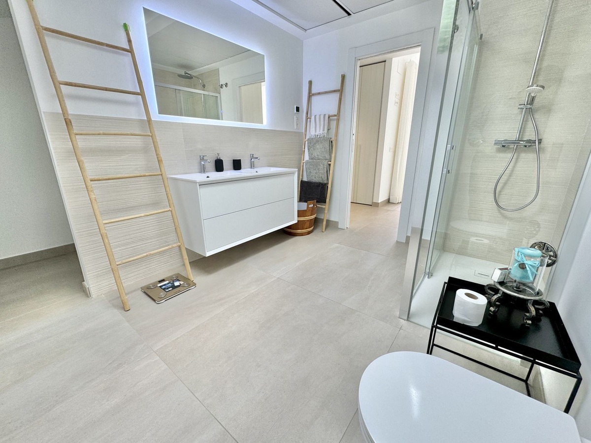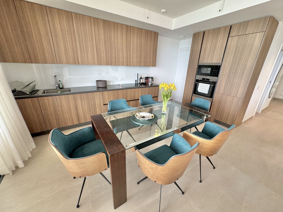 3 habitaciones dobles, 2 baños de lujo, hermosa sala de estar moderna de planta abierta con salón, comedor y cocina de diseño equipada. Lavadero independiente con conexión para lavadora y secadora, al que se accede desde la terraza cubierta. Fantástica luz desde las ventanas panorámicas, pisos de porcelana de primera calidad en todas partes y un sistema de hogar inteligente de última generación para la vida moderna. Todos los dormitorios cuentan con armarios empotrados que ofrecen un amplio espacio de almacenamiento.