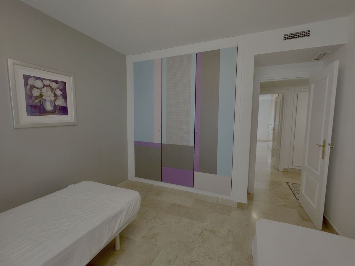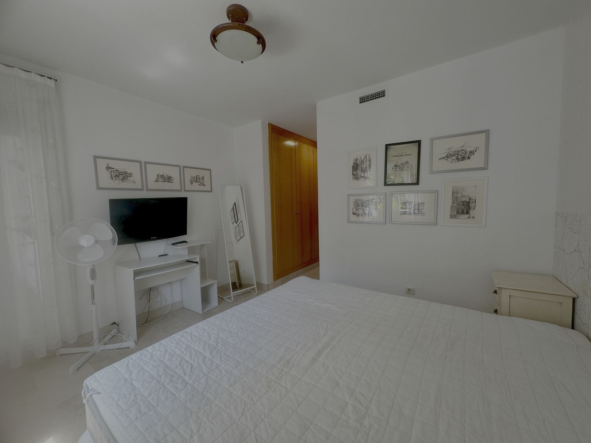 El dormitorio principal de tamaño generoso presenta acceso directo a la terraza, grandes armarios incorporados (cuatro puertas) y un baño en suite.